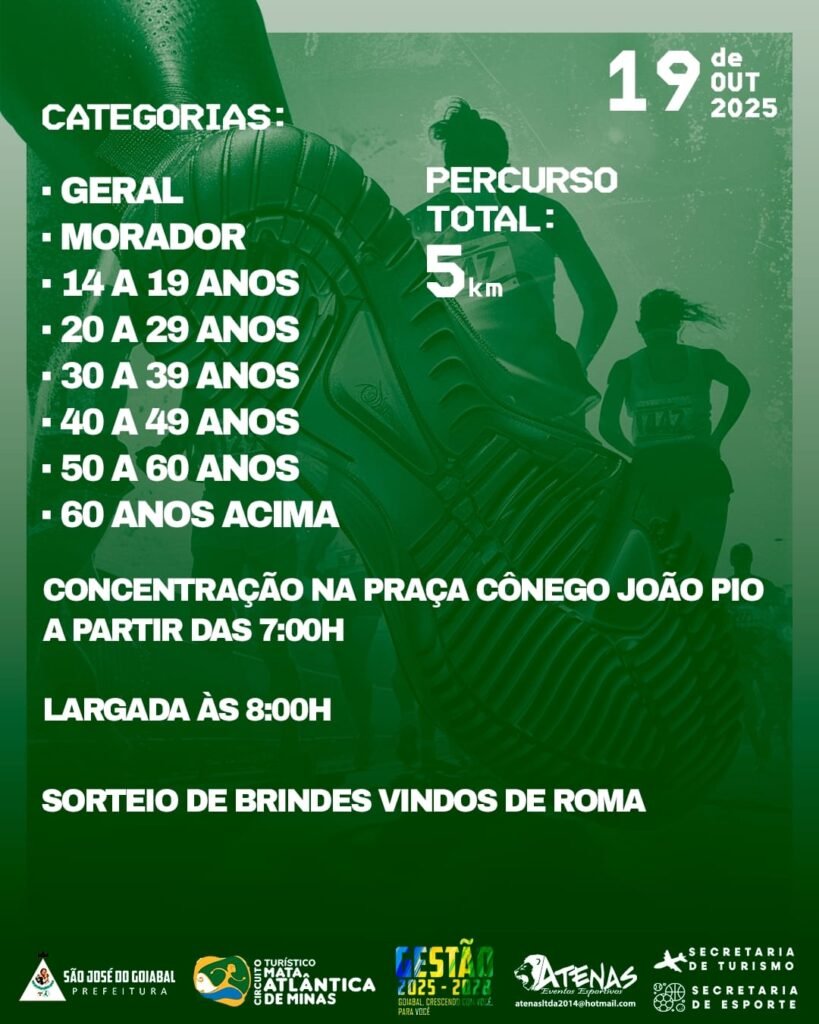 As inscrições já estão abertas pelo Sympla, com categorias masculinas e femininas, divididas por faixas etárias a partir dos 14 anos até acima de 60, além das categorias Geral e Morador. A concentração será às 7h, na Praça Cônego João Pio, e a largada oficial acontece às 8h, reunindo participantes de diferentes cidades.