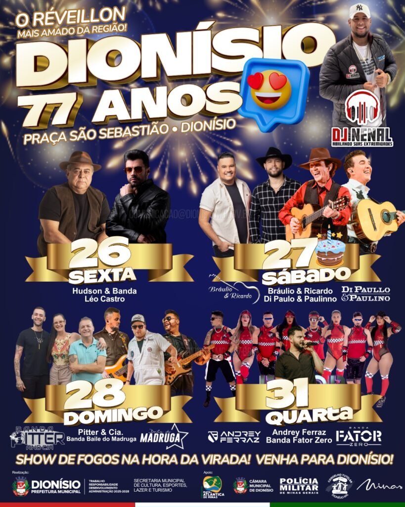 Dionísio se prepara para celebrar seus 71 anos com uma das programações mais aguardadas da região: o Réveillon mais amado, que acontece na Praça São Sebastião. A festividade, organizada pela Prefeitura Municipal por meio da Secretaria de Cultura, Esportes, Lazer e Turismo, promete reunir moradores e visitantes em quatro dias de grande celebração e muita música.