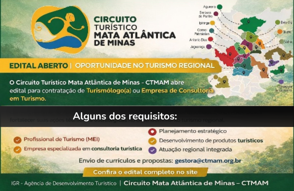 A Diretoria da IGR – Agência de Desenvolvimento Turístico do Circuito Mata Atlântica de Minas – CTMAM, no uso de suas atribuições e considerando o crescimento institucional decorrente da consolidação de 20 municípios associados, bem como a alta demanda pelos serviços técnicos e operacionais, torna pública a abertura do presente Edital de Seleção para contratação de Turismólogo, na condição de pessoa física com personalidade jurídica (MEI), ou de empresa (pessoa jurídica) especializada na prestação de serviços e consultoria em Turismo.