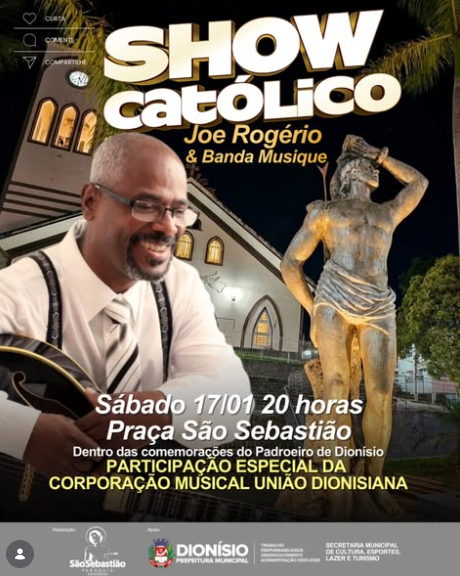 Neste sábado, 17 de janeiro, Dionísio se transforma em palco de emoção e espiritualidade com o Show Católico de @ojoerogerio & Banda Musique, dentro das comemorações do Padroeiro São Sebastião. A partir das 20h, a Praça São Sebastião será tomada por canções que tocam o coração, fortalecem a fé e reúnem famílias em um momento especial de comunhão.