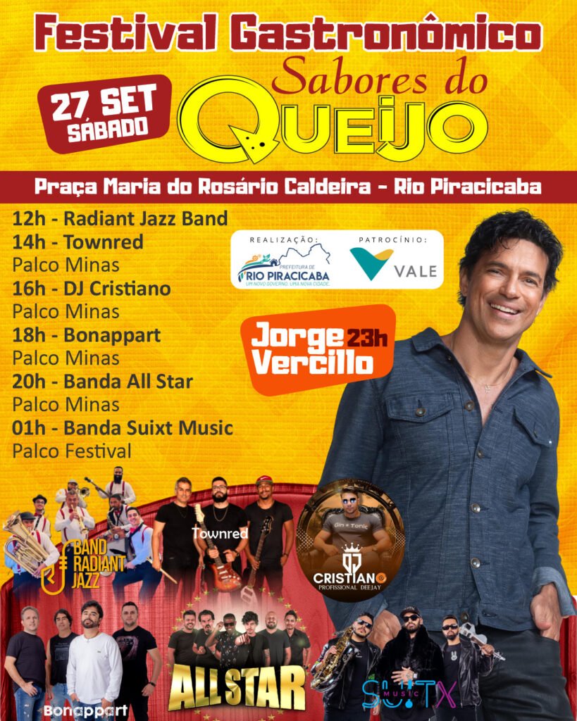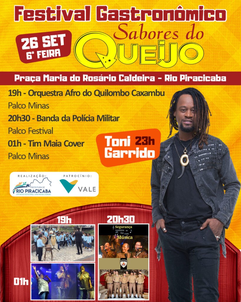Com entrada gratuita, o Festival Sabores do Queijo é uma realização da Prefeitura de Rio Piracicaba, com patrocínio da Vale, e promete reunir famílias, turistas e moradores em torno da boa música, da valorização cultural e, claro, dos sabores únicos que só Minas Gerais oferece.