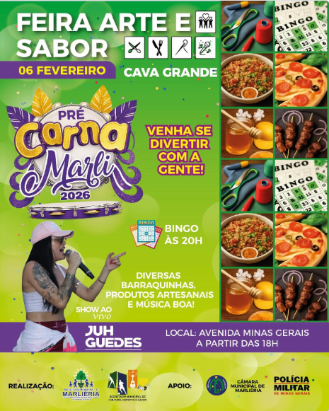 Marliéria já começa a viver a energia do Carnaval com a realização do Pré-Carna Marli 2026, marcado para o dia 06 de fevereiro, no distrito de Cava Grande, dentro da programação especial da tradicional Feira Arte & Sabor.