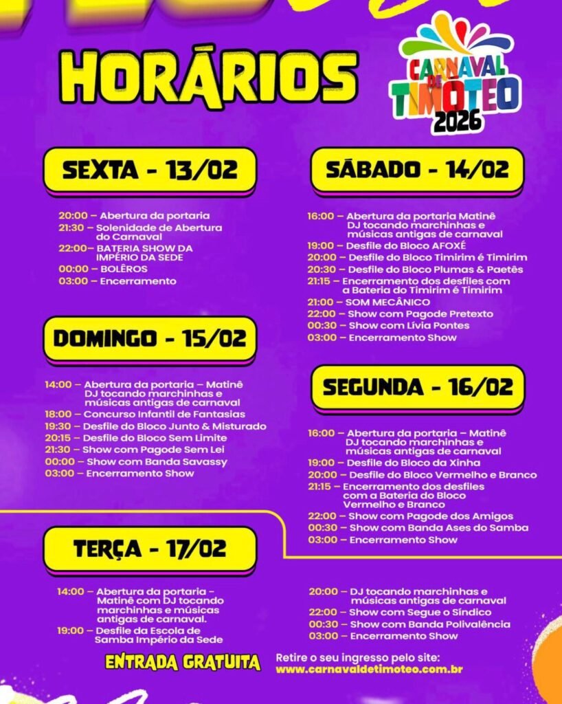 Com expectativa de lotação máxima nos cinco dias, a organização prepara uma estrutura reforçada, praça de alimentação, áreas organizadas e esquema especial de segurança. A programação reúne blocos tradicionais, escola de samba, bandas e artistas locais, em uma agenda que valoriza o samba, o pagode, o axé e a música brasileira. Além do impacto cultural, o evento deve impulsionar o comércio, o setor de serviços e o turismo regional, consolidando Timóteo como referência da folia no Vale do Aço.