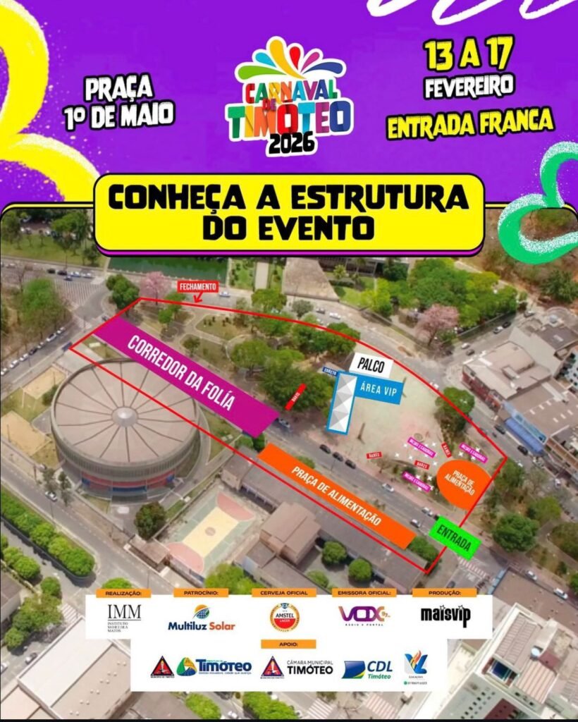 Depois de anos de hiato, a cidade de Timóteo volta a promover uma festa de carnaval. E a folia de momo começa nesta sexta-feira, 13, indo até a terça-feira,  17, na Praça 1º de Maio no Centro Norte (antiga região de Acesita). Com entrada gratuita, programação diversificada e forte mobilização popular, o Carnaval 2026, segundo o prefeito Vitor Prado, ‘já se desenha como uma das maiores edições da história do município, reunindo cultura, alegria e participação comunitária em cinco dias de festa.”
