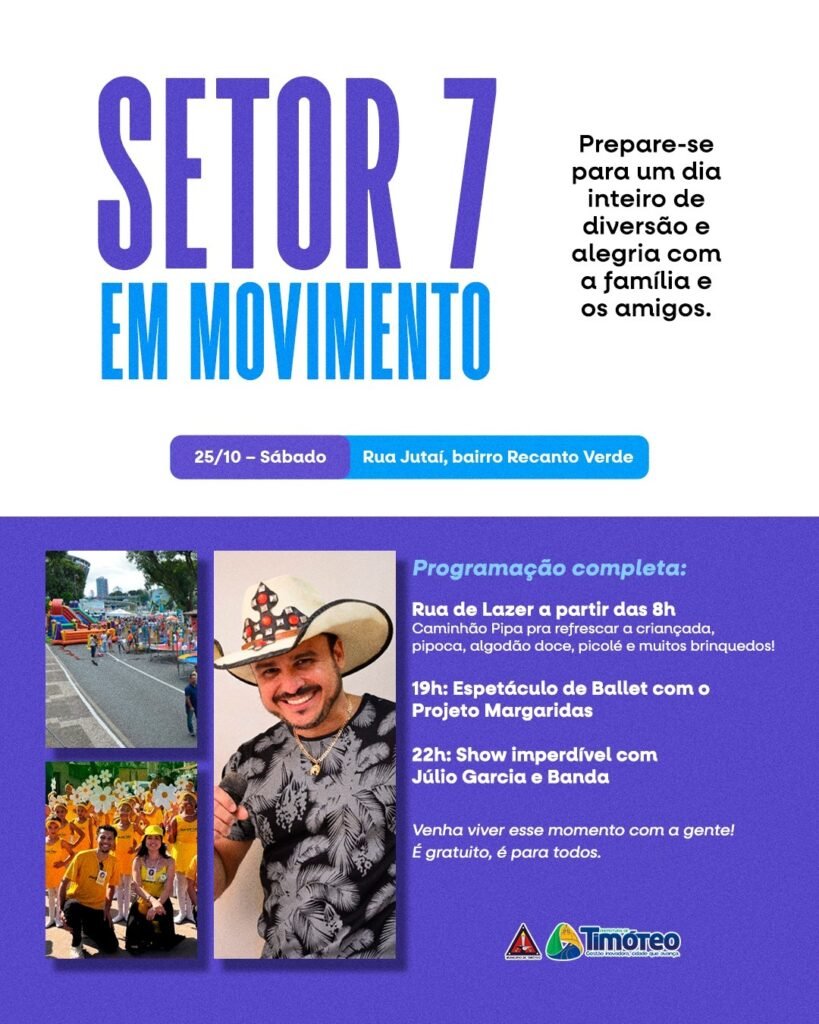 A manhã de sábado começa com o projeto “Setor 7 em Movimento”, na Rua Jutaí, no bairro Recanto Verde. A partir das 8h, a rua se transforma em um espaço de lazer com brinquedos infláveis, caminhão pipa, pipoca, algodão doce, picolé e muita diversão para a criançada.
