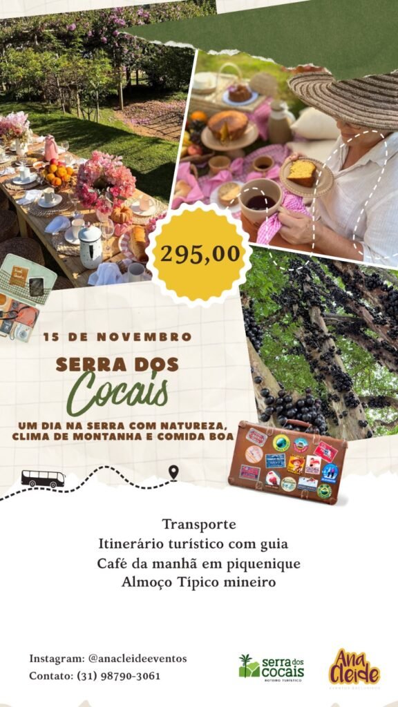 Durante o dia, os participantes também poderão degustar vinhos, licores e queijos artesanais, além de curtir um lanche especial com delícias da terra, encerrando o passeio com música ao vivo e clima de confraternização. O evento é organizado por Ana Cleide Eventos Exclusivos, e conta com saída programada da Prefeitura de Coronel Fabriciano, das 7h às 17h.